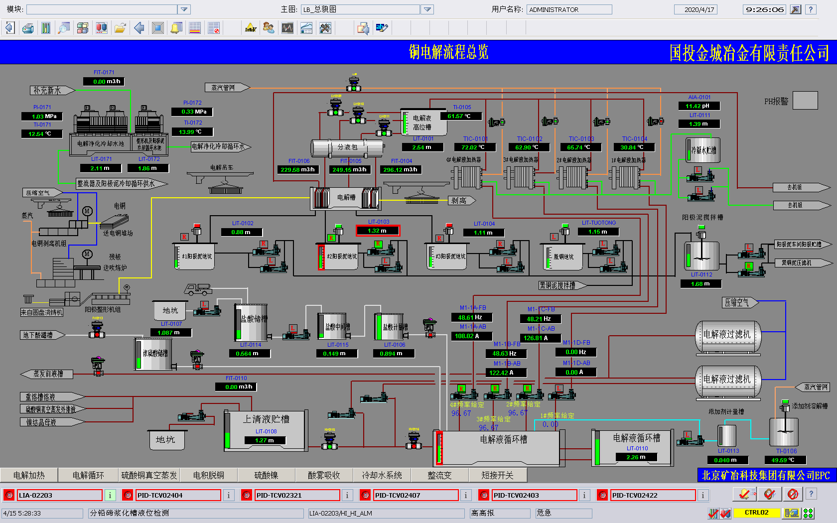 由矿冶集团总承包的湿法电解区域EPC工程总承包位于河南省灵宝市豫灵镇,生产流程为火法冶炼产出的粗铜,经过电解精炼产出精铜,阳极泥湿法综合回收贵金属。该工程包括电解车间和阳极泥处理车间,两车间相互独立,各设置一套DCS控制系统,均采用冗余控制器+工程师站+操作员站的架构,通过环网联通整个系统。采集的实时生产数据集中归档,并设置一台OPC客户端用于和全厂生产信息管理系统联网,实现全厂资源统一管理。DCS系统针对电解车间电解液加热调节阀频繁,设计带蒸汽压力前馈的PID温度调节,针对添加剂槽蒸汽大,重新设计仪表测量系统,稳定投料速度,减少表面凸瘤和粒子的产生。集成阳极整型机组、天车定位、电解槽短接开关系统、电解液循环过滤系统、阴极剥离机组、残极洗涤机组、真空蒸发机组等子系统,集中显示调配关联数据,方便工艺监控生产过程。